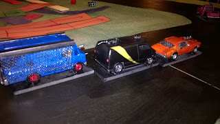 I ended up with Coppertop, David got the Flatbed and Ziggy got the Orange Camaro. We were also testing out my new track. I am happy with it. You can see the various move templates in the infield.