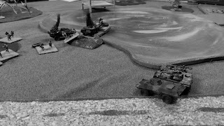 Hardly Kursk, but a glorious tank battle nonetheless! The PT-76es completely dominate the Pattons, a victory owed in no small part to "Extra Determination" earned in the previous turn.